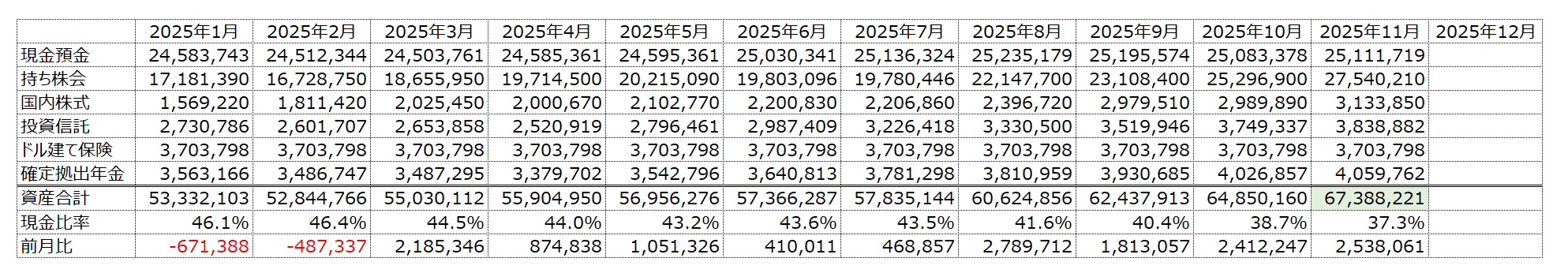 妻の資産を除き、67,388,221円というのが2025年11月末時点での資産状況です。